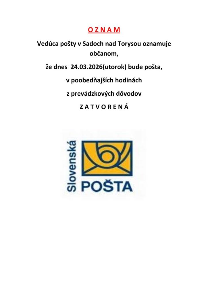 Pošta 24.3.2026 poobede zatvorená 1