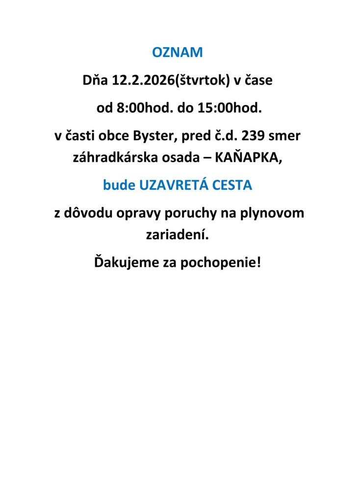 12.2.2026 uzavretá cesta Byster smer záhradkárska osada Kaňapka