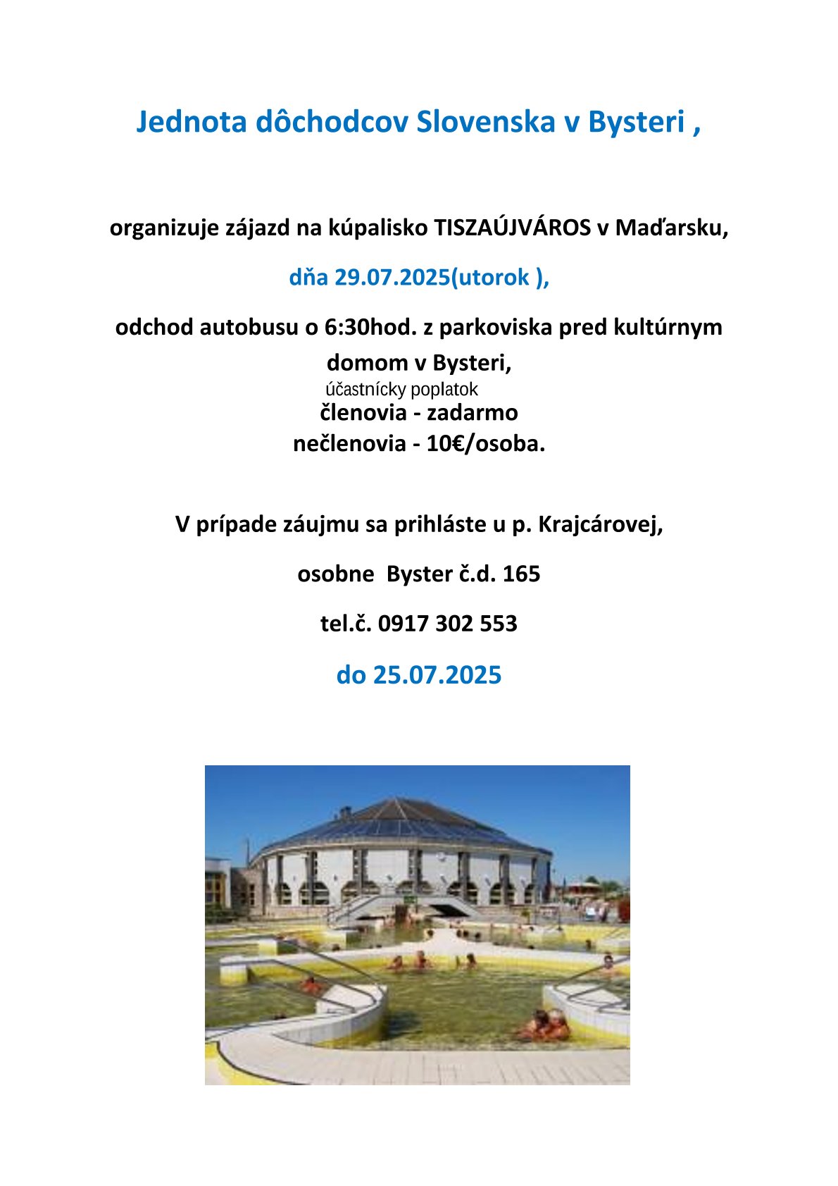 Jednota dôchodcov v Bysteri organizuje zájazd 29.7.2025